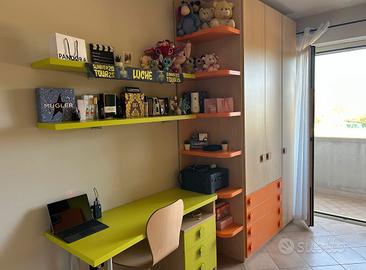 Vendo cameretta (ACQUISTATA ORIGINARIAMENTE AL PREZZO DI 4.000€ PRESSO MOBILIFICIO MOBIL JOLLY) completa con struttura a soppalco, dal design moderno e vivace nei colori verde , arancione e legno chiaro. La soluzione è perfetta per ottimizzare lo spazio in stanze non troppo grandi, offrendo tantissimo spazio contenitivo.