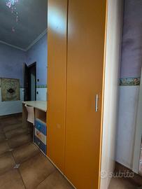 Cameretta ponte l. 270 h. 257,60 + scrivania con cassettiera l. 120 e sedia. Armadio con ante arancione e panna.