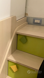 Cameretta ponte Colombini con due letti scorrevoli, scala con ante e cassetti, due cassetti e una mensola nel letto di sotto, mensola nel letto di sopra, armadio due ante con 4 cassetti