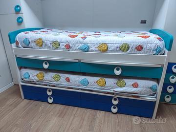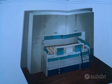 Vendo arredamento cameretta composto da: n. 1 armadio a ponte come illustrato in foto; n. 2 letti entrambi estraibili completi di materassi; ripiano mensole (non montato in foto, visibile nel progetto).