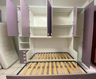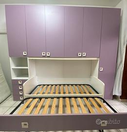 Vendo bellissima cameretta completa in ottime condizioni, ideale per chi cerca una soluzione pratica, capiente e perfetta per due persone. La cameretta è composta da: •6 ante molto spaziose •4 cassetti/comodini comodi per riporre vestiti, biancheria e oggetti •letto con secondo letto estraibile, perfetto per due persone •vani a giorno laterali utili per libri, giochi o decorazioni Il colore lilla e bianco la rende delicata, luminosa e adatta sia a una cameretta per bambine/ragazze sia a una stanza ospiti. È una soluzione molto funzionale perché unisce in un solo arredamento: armadio, contenitori, libreria e due posti letto, occupando bene lo spazio e offrendo tanta capienza. Misure: •Profondità: 58,5 cm •Lunghezza: 3 m ( e mezzo cm) •Altezza: 2,58 m Preferirei che venisse smontata e presa in carico da chi acquista.