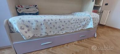Cameretta ponte ragazza colore glicine, utilizzata 5 anni. Dispone di letto singolo con materasso incluso e un secondo letto estraibile separato. Misure: lunghezza 280cm, altezza 235 cm, profondità 54 cm, misure letto: lunghezza 198 cm profondità 80cm. Trasporto a carico dell'acquirente disponibile a partire dal 20 Ottobre e, causa mancanza spazio, solo per pochi giorni.