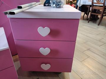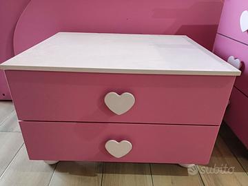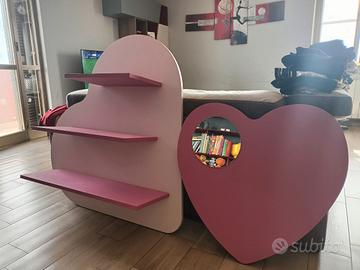 Cameretta composta da letto singolo in similpelle con spalliera a cuore, armadio 4 ante, comodino, scrivania con cassettiera, 2 mensole a cuore, buono stato