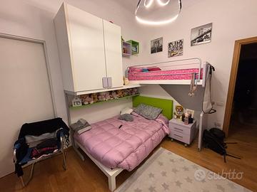 Vendo cameretta ragazza, con letto a una piazza e mezzo e letto a soppalco a una piazza, con armadio a due ante scorrevole e libreria più armadio due ante sopra il letto. In ottime condizioni compresi materassi e scrivania con sedia. Disponibile subito. Smontaggio e trasporto a carico acquirente. Prezzo trattabile