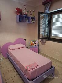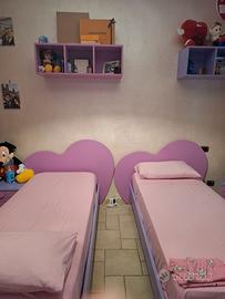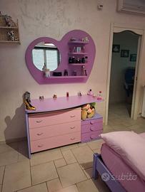 Cameretta ragazze Completa di armadio e armadietto Sedia Scrivania con cassettiera grande incorporata Specchio con mensole 2 letti con reti e materassi 2 comodini 2 cubi a 3 portaoggetti Color glicine e lilla