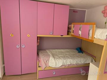 Cameretta con doppio letto singolo, un letto ponte e un letto contenitore, più doppio armadio con scaletta con cassetti e un comodino.