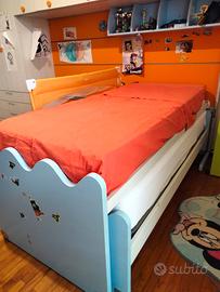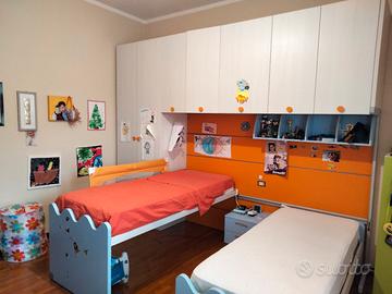 cameretta per ragazzi con 2 letti scorrevoli più letto d'emergenza, armadio a ponte e comodino. Il letto più alto scorre su una guida a parete e può sovrapporsi all'altro lasciando la stanza libera per il gioco. il terzo letto si trova sotto il più basso e si può tirare fuori all'occorrenza. Smontaggio e trasporto a carico dell'acquirente.