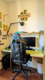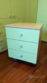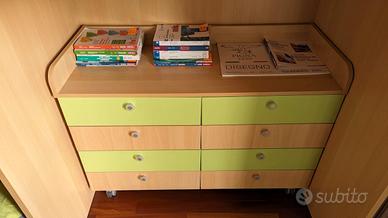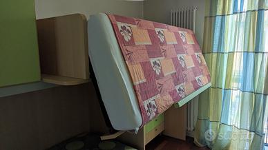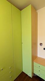 Completa di: 3 moduli armadio da 90cm. + 1 modulo armadio ad angolo da 106cm + 1 scrivania + 1 mensola + 1 letto singolo con materasso come nuovo + 1 letto singolo a soppalco con meccanismo a ribalta e materasso come nuovo + 1 comodino con ruote e 2 cassetti + 1 cassettiera con 8 cassetti + 1 scaletta + 1 mensolina.