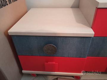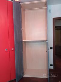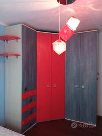 Cameretta completa composta da: armadio laterale con cassetti e vano appendiabiti alt. 2,60 prof. 60 largo 60 Armadio centrale rosso vano interno angolare con ripiani e appendiabiti alt. 2,60 larga 80 cm circa Armadio laterale jeans vano interno con porta abiti, prof 60 cm, alt 2,60 largo 80 cm mensole laterali, manopole in metallo. Scrivania prof 60 cm larga 1m e 40 cm più cubotti rossi componibili. Libreria alta 2 metri e 60cm prof 40cm larga 90 cm Comodino letto profondo 40 cm e largo 50 cm. Lunghezza ponte keto 1meteo e 90 cm Valore commerciale sul nuovo 3200 pochi anni di vita e in perfette condizioni. Prezzo trattabile. La cameretta è già smontata solo.da portare via