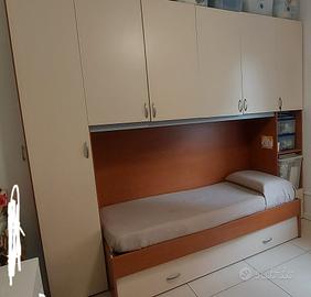 Vendo bella cameretta per ragazzi/e tenuta molto bene, composta da letto a ponte con cassettone contenitore (sotto), e mobile libreria ( volendo nella parte centrale si possono montare anche gli sportelli in vetro).