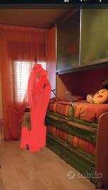 Cameretta Moretti Compact modello Polaris, struttura in faggio, frontali arancio e verde, completa di angolo cabina, ponte con due ante scorrevoli metacrilate, due letti space su ruote. Contattare Stefania 347/1165271