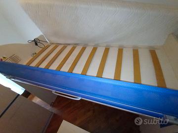 Struttura letto in legno colore arancione/ mirtillo composta da doghe in legno, scaletta in legno chiaro e mirtillo con ribalta contenitore.ripiano sottostruttura x libri. Nell' eventualità è possibile inserire un secondo letto sotto oppure come da foto una scrivania.( Che vendo separatamente )