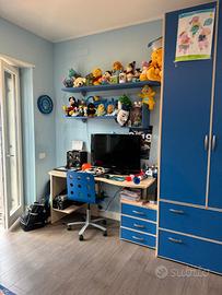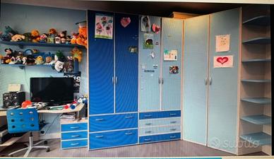 Cameretta ragazzi Moretti Compact (attualmente leader nel settore) ottime condizioni composta da: Cabina armadio 126 * 126 con terminale a 8 ripiani, armadio 2 ante da 96 cm con 4 cassetti, armadio 2 ante da 96 cm con 2 cassettoni, scrivania sagomata da 150 cm con porta pc e cassettiera girevole con gamba alluminio, sedia in tinta con ruote, 1 cubetto pensile, 2 mensole corte (1,6 mt + 2 mt) 2 mensole da 250cm con reggi-mensola in alluminio, letto sagomato con rete e rete estraibile automatica, comodino con ruote e 2 cassetti. Vendo esclusivamente per divisione camera (non entra nelle nuove in quanto sono circa 6 ml). Possibilità di distribuzione differente dei componenti. Ottima qualità del prodotto con materiali che non hanno nulla a che vedere con gli attuali. Un composizione del genere (avendo girato molto per le nuove camerette mi sono fatto una cultura) non trova qualità uguale in commercio e seppur con prodotti di più bassa qualità costerebbe oltre ottomila euro. Allego foto che ho dovuto fare a settori in quanto troppo era troppo lunga la composizione. Nella foto 6 ho fotografato una panoramica dal pc (pertanto si vedono delle linee che sono del monitor) per avere una immagine completa anche se di bassa qualità. Cameretta già smontata e conservata con cura in box privato. Gli adesivi e immagini attaccati sulle ante sono stati rimossi in sede di smontaggio senza lasciare alcuna traccia sui pannelli.