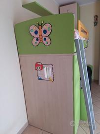 Cameretta Colombini composta da letto a castello con rete ribaltabile e scaletta in alluminio per accedere al letto superiore.