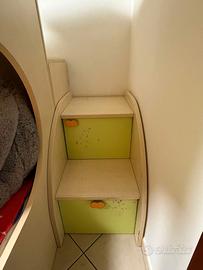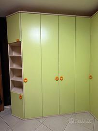 Armadio angolare 7 ante con una cassettiera interna - armadio ponte con scrivania corredata da cassettiera e mensola estraibile che rendono la scrivania angolare - letto a castello con terzo letto a scomparsa corredato di comodino più scale a cassettone e corridoio contenitore