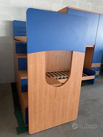 Cameretta con letto a soppalco per bambini e ragazzi, con due posti letto, quello superiore montato su un’anta scorrevole a copertura di una scaletta con cassettoni.