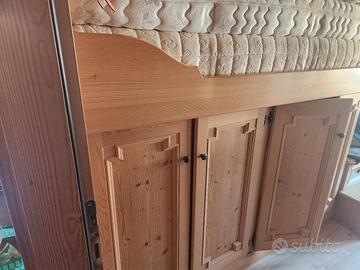 letto con sotto 2 armadi uno a mensole e latrocon dietro mensole e davanti asta per appendere abiti,cameretta artigianale in legno massello abete verniciata all'acqua, per chi volesse c'è la scrivania pieghevole abbinata