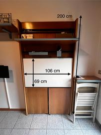 Perfetta per spazi piccoli, studio o cameretta. Struttura in legno con scrivania pieghevole e vani contenitori. In ottime condizioni.
