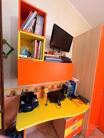 cameretta moretti compact con 3 letti scrivania mobile un anta più alto mobile 2 ante di cui una ad angolo mensole sopra scrivania