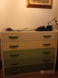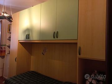 Cameretta ragazzo misure260hx302Lx55largh , color legno con tonalità verdi; dotato di 3 cassetti laterali e due grandi sotto letto. È accompagnato da cassettone negli stessi toni, misure: 104x93hx57largh. Ritiro a carico dell'acquirente.