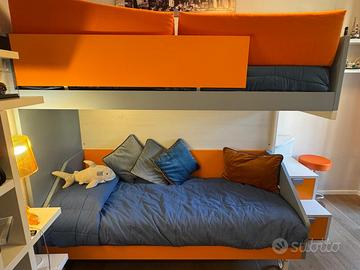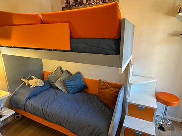 vendo camera ragazzo/a bianca e arancione composta da letto a castello con scaletta contenitore, scrivania (3 cassetti) e sedia gamer nera e rossa