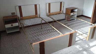 Cameretta composta da armadio di medie dimensioni, due comodini e due letti singoli che uniti possono formare un letto matrimoniale.