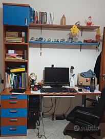 Armadio a ponte con sotto due letti contenitori, scrivania con cassetti e angolo libreria con ripiani, più due mensole a muro. Specchio e lampadario compresi nel prezzo