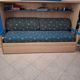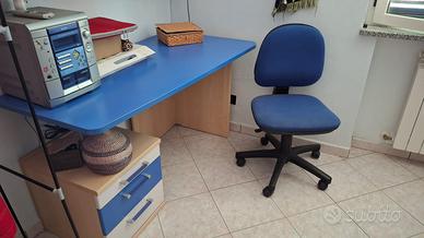 Vendo per cambio arredamento cameretta completa di armadio a ponte, 2 reti, scrivania con cassetti, comodino e mensole abbinate (2+4). Colore blu cobalto e glicine chiaro.