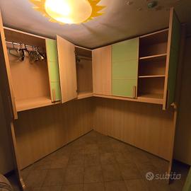 1. Armadio angolare a ponte frassino e verde (misure: larghezza 211x211 cm, h 227 cm, profondità 60 cm, piede profondità 56 cm);