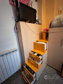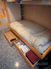 Cameretta due posti letti a castello letto superiore ribaltabile per rifarlo comodamente. 4 scalette con cassetti e sportelli per accedere al letto superiore.