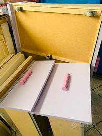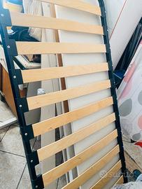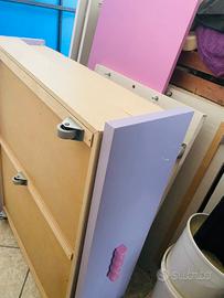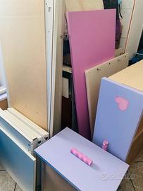 Cameretta due posti letto, purtroppo non ho foto mondata, e’ composta da un letto inferiore con rete in doghe e due cassettoni estraibili con ruote. Un letto superiore con scaletta e barra di protezione. Due colonne armadi di cui una con due cassetti. E’ lunga circa tre metri, ha circa 10 anni , tenuta bene, giusto qualche adesivo. Già smontata, il prezzo è trattabile.