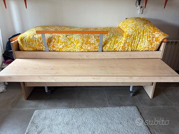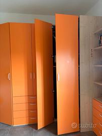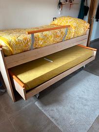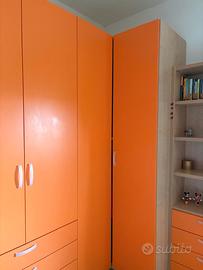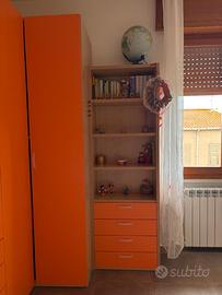 Cameretta in legno composta da: Armadio angolare: 240x 100 profondo 59 cm alto 227 cm / angoliera 100 x 100 Doppio letto con scrivania estraibile: 2.08 x 90 cm Libreria: 66x34 alta 195.5 cm In vendita solo uno dei due materassi visibili in foto