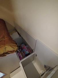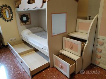 Cameretta in ottimo stato, composta da letto a castello con tre cassetti a scale, due contenitori sotto il letto, e due contenitori sul ponte del letto superiore.