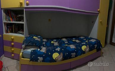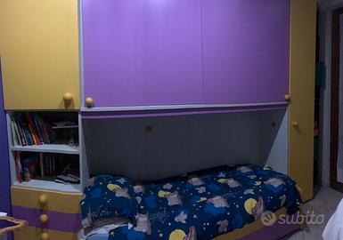 Include letto singolo con due cassetti inferiori, due armadi laterali a tutta altezza (uno con quattro cassetti interni) e due ampi moduli sospesi sopra il letto. In buone condizioni. Completo di manuale di montaggio.