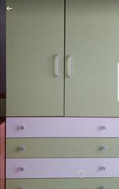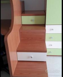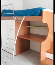 Vendesi cameretta con letto a soppalco, composta da: letto superiore con materasso, scrivania, vano armadio sotto il letto, scaletta con cassetti contenitore e armadio con due ante + 4 cassetti.