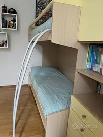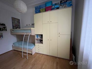 Cameretta alta qualità (Spagnol), in ottime condizioni. Il letto misura 201cm (ingombro) x 90cm ed è adatto ad un materasso 80cm x 200cm. L’altezza del letto è 145cm (materasso superiore) e arriva ad un altezza totale di 175 (panelli laterali e sbarra). L’armadio è composto da tre elementi separati che misurano 60-90-60 ed è alto 266cm. Smontaggio e ritiro a carico dell’acquirente.