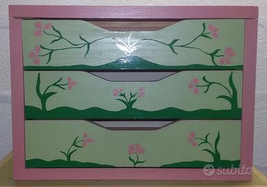 Cameretta stile inglese con soggetti in rilievo fatti a mano. Composta da 10 pz. Specifiche Tecniche: - ARMADIO H.156 L.95 P.50 - ARMADIETTO H.104 L.76 P.44 - CASSETTIERA DA PAVIMENTO H.90 L.80 P.50 - CASSETTI ARMADIO H.28 L.40 P.30 - CASSAPANCA H.43 L.87 P.38 - SCRIVANIA H.76 L.96 P.46 - COMODINO H.60 L.50 P.46 - MENSOLA PARETE H.50 L.80 P.19 - SGABELLO H.50 L.35 P.35 - CASSETTI SCRIVANIA H.23 L.60 P.30 Buono - usato ma ben conservato. Solo consegna a mano e pagamento in contanti.