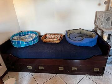 Camera composta da letto singolo a divano con cassetti, comodino, scrivania con sedia, libreria, libreria appesa e armadio. Camera della ditta " Vecchia Marina" tutta in mogano.