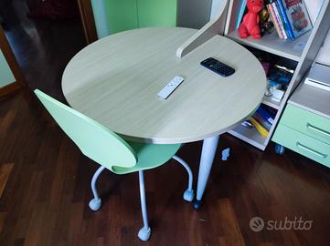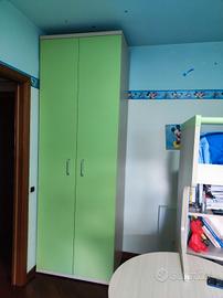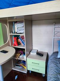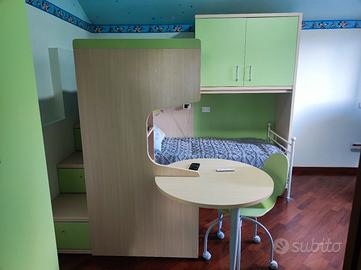 Cameretta su 2 piani Spagnol, ideale per bambini, color frassino/verde mela (non le camerette di Mondo Convenienza e simili) acquistata da Di Paolo Arredamenti (chi è della zona di Teramo sa di cosa si parla) 20 anni fa. I miei ragazzi sono cresciuti e non è più adatta alle nostre esigenze. Il gruppo principale dei 2 letti forma una L delle dimensioni di cm. 260 x 200 con una altezza massima di cm. 217. L'armadio più grande, molto capiente, ha 3 ripiani interni con appendiabiti montato sotto al ripiano più basso e misura altezza 265 cm x larghezza 90 cm x profondità 60 cm. L'altro armadio, ovviamente più contenuto, misura cm 124 x 83 circa ed è diviso internamente in due parti, ciascuna delle quali ha un ripiano interno per un totale di 4 ambienti delle dimensioni di cm 38 x 56. L'accesso al letto superiore, avviene mediante 3 gradoni nei quali sono ricavati altrettanti capienti cassettoni, come da foto. La scrivania ha un diametro di 90 cm e viene corredata dalla bella sedia color verde mela. Completano la cameretta una pratica e capiente libreria a 4 vani e il comodino a 2 cassetti su ruote.