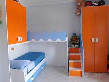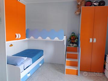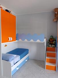 vendo cameretta come da foto...l'armadio puo essere montato sia dove si trova adesso o accanto al letto basso...smontaggio e trasporto a carico dell'acquirente