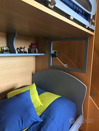 Moretti Compact - mobile letto componibile composto da: un letto con ruote, scala di accesso al letto superiore con gradoni contenitori, letto superiore scorrevole lateralmente per facilitare la pulizia e la sistemazione delle coperte. Mensola porta oggetti. Finiture in larice e laccato colore cielo. Completo di materassi. Misure 100 x 250 - altezza 170. Smontaggio già effettuato.