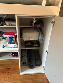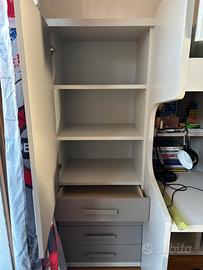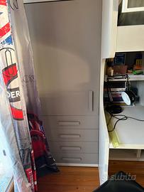 Letto a castello UP , con sotto colonna da 60 cm pr. 90 cm 1 anta uso sgabuzzino + scrittoio da 135 cm + libreria 135 cm sopra e sotto scrittoio, protezione letto Timber in metallo ribaltabile scaletta timber metallo, colonna a lato da 60 cm h 168 cm pr 48 cm con 4 cassetti. Grigio / bianco