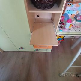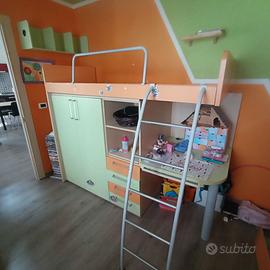 Cameretta salva spazio, composta da letto a castello, scrivania, vano libreria, vano estraibile, ideale per stampante e capiente armadio. Il letto è dotato del meccanismo di ribaltamento per rendere più agevole il rifacimento del letto. Comprensiva di doghe, piva di materasso. Trasporto e montaggio a carico dell'acquirente. Comprensiva di vano libreria.