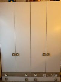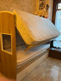 Cameretta con letto a castello e terzo letto a scomparsa , armadio per due persone e scrivania con armadietto e cubi porta oggetti.