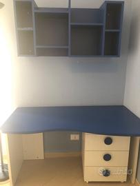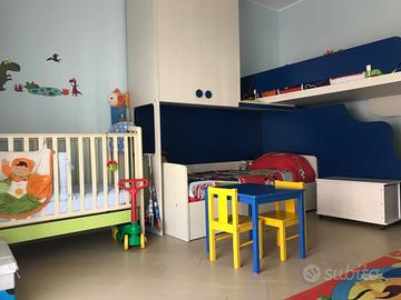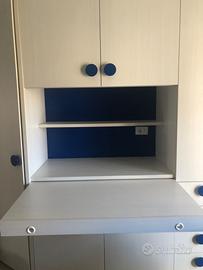 Cameretta Mistral composta da armadio quattro ante con scrittoio estraibile più libreria angoliera; gruppo tre letti angolare (due a castello con scaletta contenitore e uno estraibile) completo di materassi; scrivania dotata di cassettiera con ruote; cubotti libreria a muro.