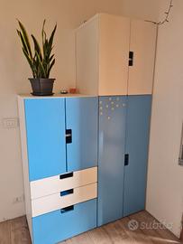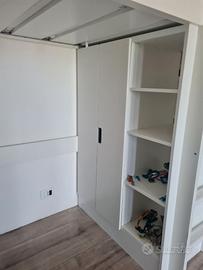 Cameretta a ponte lunghezza 210 cm , altezza 181 cm e profondità 107 cm con inseriti scaletta, armadio e scrivania, quest'ultima cm 167 x 74 h x 62 prof. dotata di cassapanca cm 90x 51 x h. 48. Ulteriori due armadi cm 60x129 h. e 51 profondità + cm 60x192.5 h. x 51 profondità e altra cassapanca sempre cm 90x 51 x h. 48. La scrivania presenta un graffio di circa 10 cm come da ultima foto