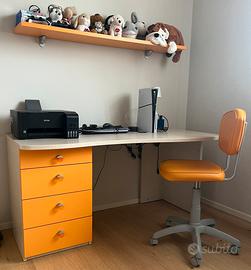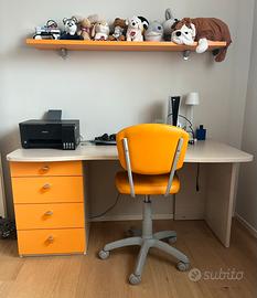 Cameretta a ponte con letto singolo, due cassettoni sottostanti con ruote, comodino e scrivania con due mensole.