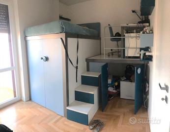 Vendo cameretta marca Tumidei, modello Soppalco con trafila, da ritirare e smontare in loco a carico dell'acquirente. La cameretta è costituita da un letto su soppalco di dimensioni cm 212x124 con testiera imbottita altezza 49 cm, al di sotto cabina armadio chiusa altezza 166 cm. con tubo appendiabiti e luce led con sensore. Completa il soppalco una zona studio con scrivania di dimensioni cm 122x59 h 78. E' presente uno spazio contenitore al di sotto del soppalco con altezza di cm.110. Il soppalco è raggiungibile tramite gradini contenitore. Composizione cinque mensole tipo t-box. compresa cassettiera a tre cassetti su ruote e sedia SE10. Materiali alluminio, pannelli finitura olmo nobilitato calce, pomoli laccati opaco blu prussia ed azzurro polvere. Smontaggio e ritiro in loco