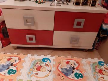 Vendo cameretta unisex colore rosso e beige come nuova. La cameretta a ponte è composta da armadio con 2 ante scorrevoli e colonna con libreria e 3 cassetti che costituiscono un unico blocco. Le misure sono: Lunghezza armadio+colonna 2.42 cm Altezza armadio+colonna 2.40 cm Profondità armadio+colonna 50 cm In più è presente un'altra colonna che volendo può essere staccata dal blocco le cui misure sono: Lunghezza colonna 46 cm Profondità colonna 38 cm Altezza colonna 2.40 cm La cameretta dispone anche di un mobiletto con 4 cassetti dotato di rotelle che può essere quindi posizionato dove meglio si crede le cui misure sono: Lunghezza mobile cassetti 91 cm Altezza mobile cassetti 50 cm Profondità mobile cassetti 47 cm Prezzo totale 150 € con ritiro e smontaggio a carico dell'acquirente. La cameretta si trova a Falconara marittima 2° piano con ascensore. Specifico che nel prezzo non è incluso il letto che eventualmente è vendibile separatamente.