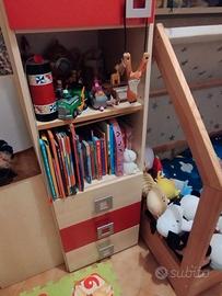 Vendo cameretta unisex colore rosso e beige come nuova. La cameretta a ponte è composta da armadio con 2 ante scorrevoli e colonna con libreria e 3 cassetti che costituiscono un unico blocco. Le misure sono: